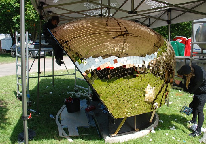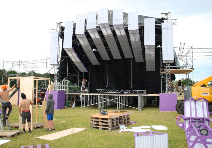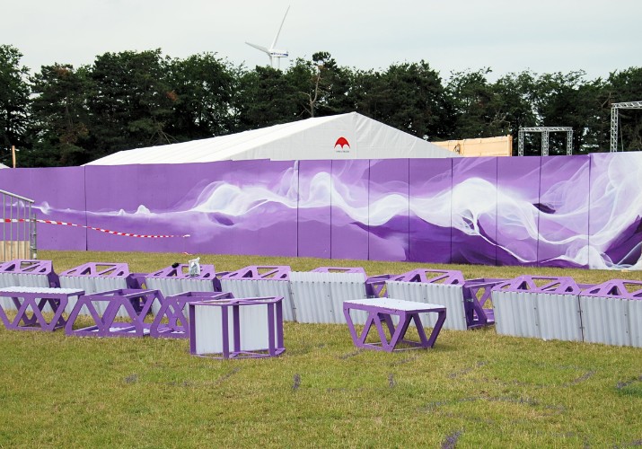 Vad gör man med termoplåtarna när de inte längre behövs för Apollo-scenen? De är ju i perfekt skick och kan hålla i många år till… Plåtarna återanvänds självklart backstage. Bland annat skapades en smart bardel av plåtarna – här ses en bar som verkligen är stöttålig och klarar av rikliga mängder fukt. Under tiden byggdes också takskydd som gav skydd mot den brännande solen under dagen och som senare på kvällen höll kvällsdaggen borta. I Backstage Village, området för proffs och media, byggdes det med trapets- och termoplåtar.